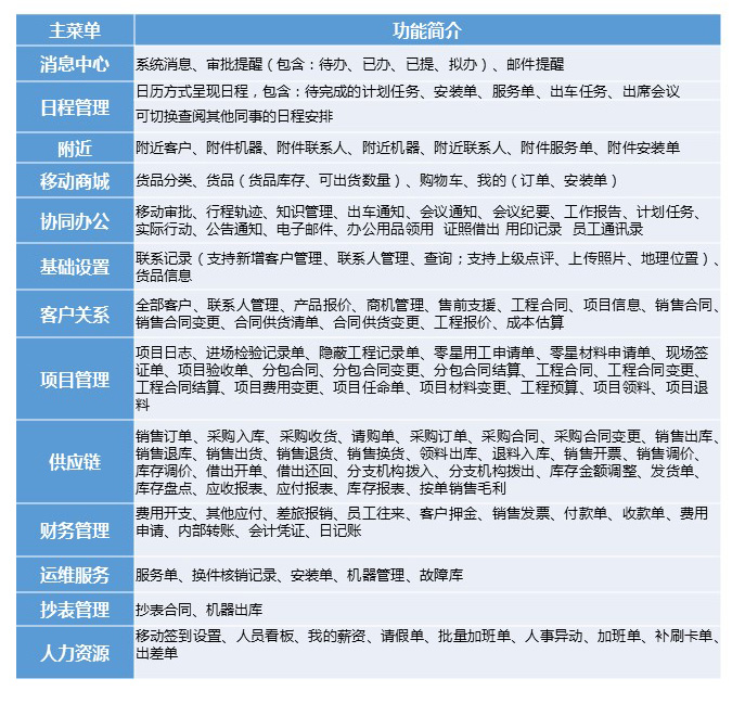 移動(dòng)服務(wù)接單、機(jī)器二維碼掃描、手機(jī)拍照定位、機(jī)器新增查詢、耗材查詢、客戶新增查詢、實(shí)時(shí)庫(kù)存查詢、知識(shí)庫(kù)查詢、應(yīng)收款及對(duì)帳、移動(dòng)辦公及審批等;