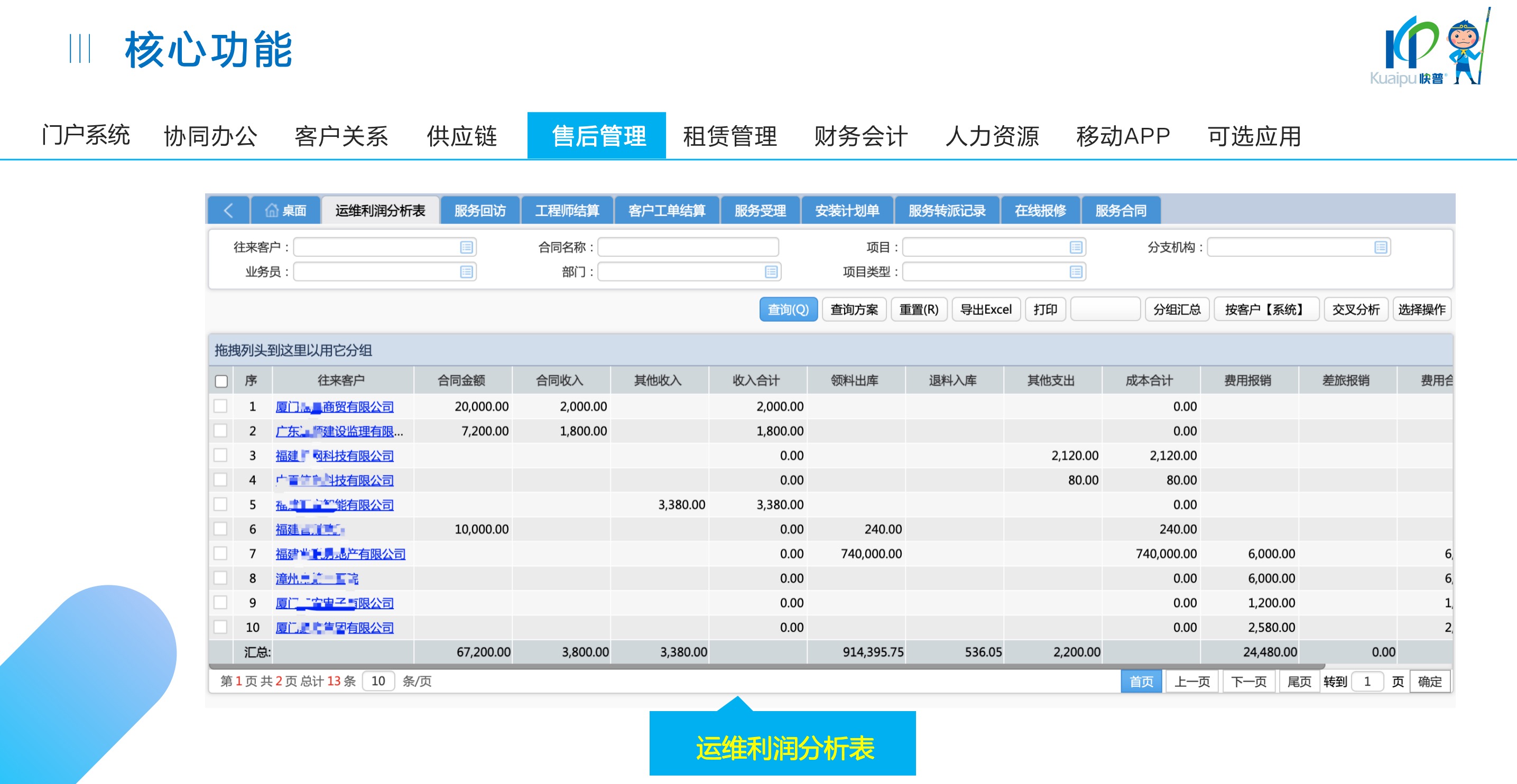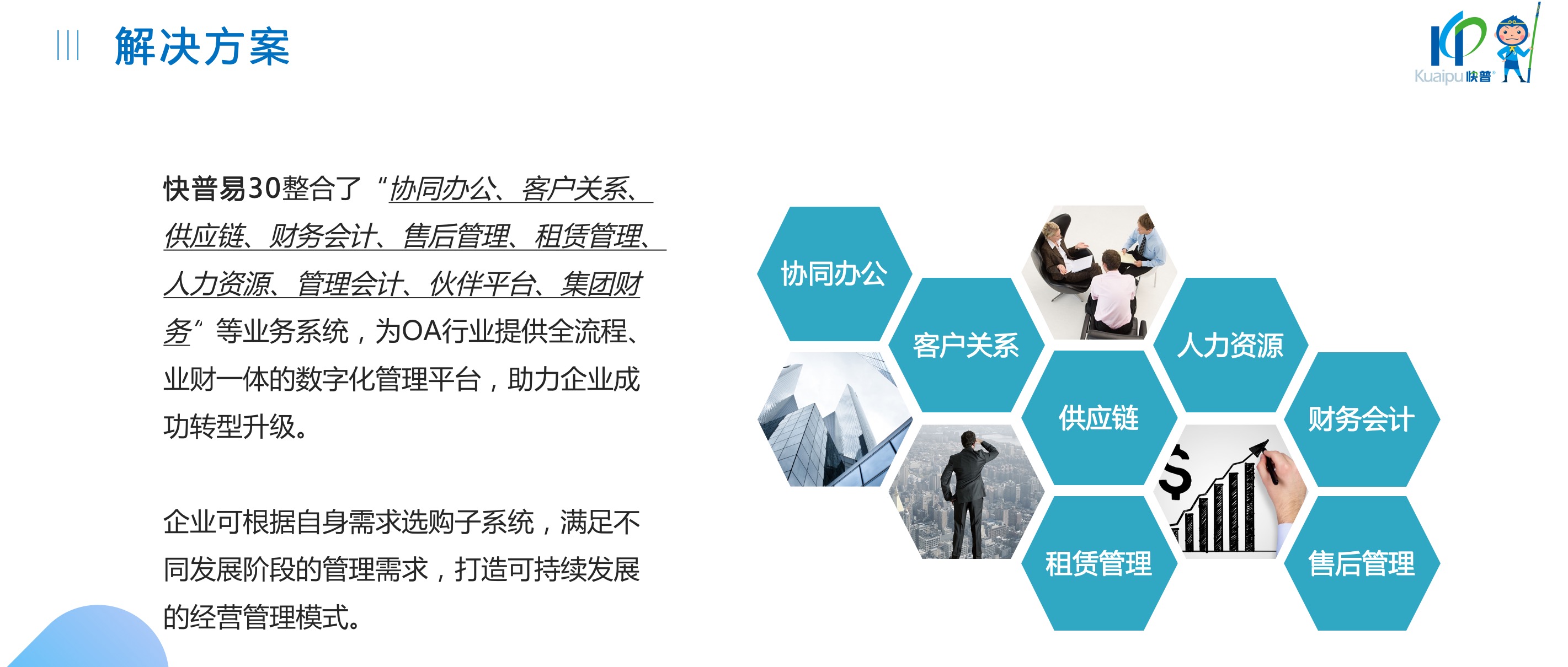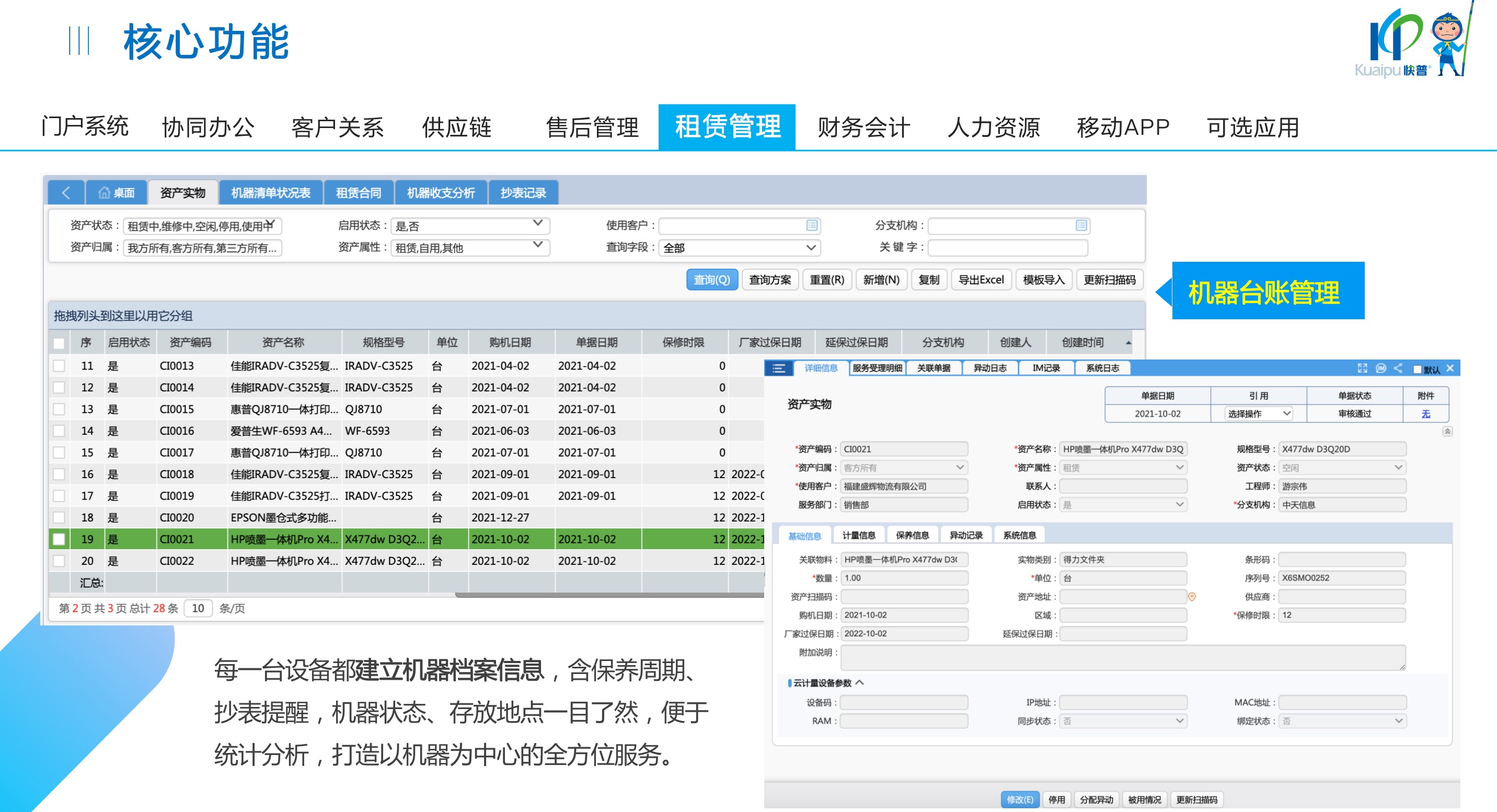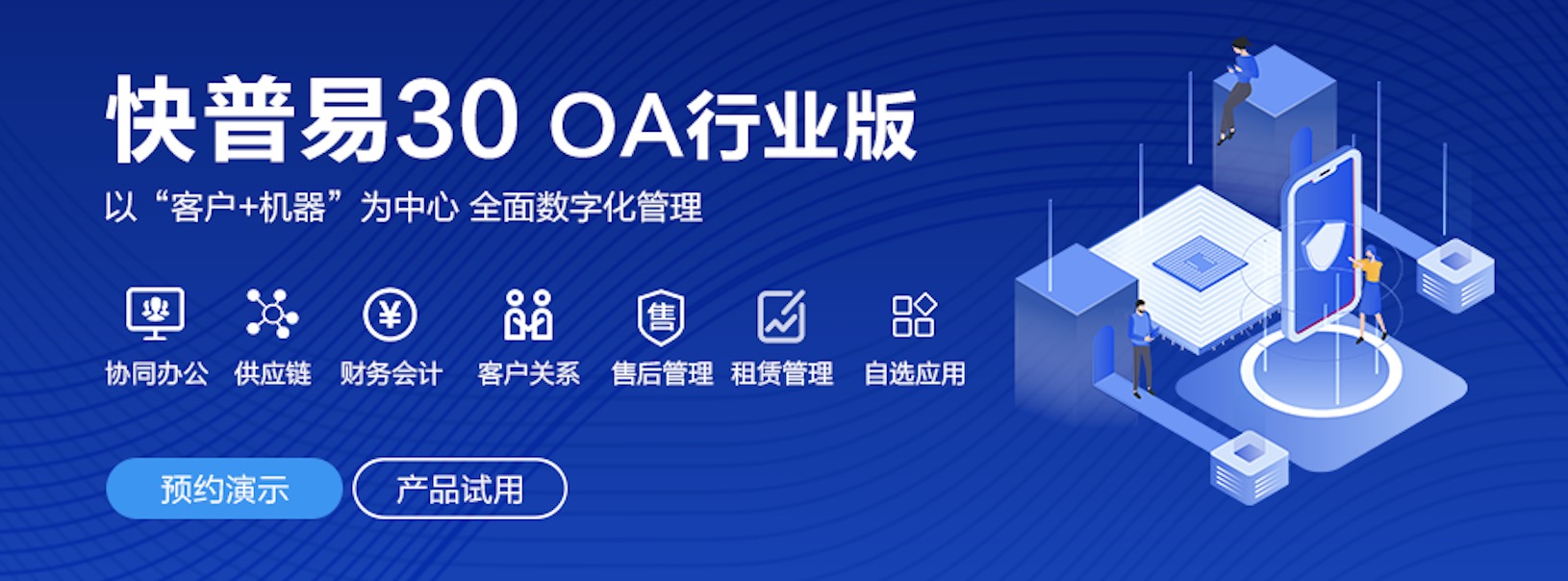 快普易30基于快普近20年在全國上萬家OA企業(yè)的實施與服務經(jīng)驗,融合了行業(yè)成功的管理智慧,以“客戶+機器”為中心提供數(shù)字化轉型解決方案,全面解決銷售、服務、租賃等多種業(yè)務模式的管理需求,以及企業(yè)經(jīng)營核算分析。