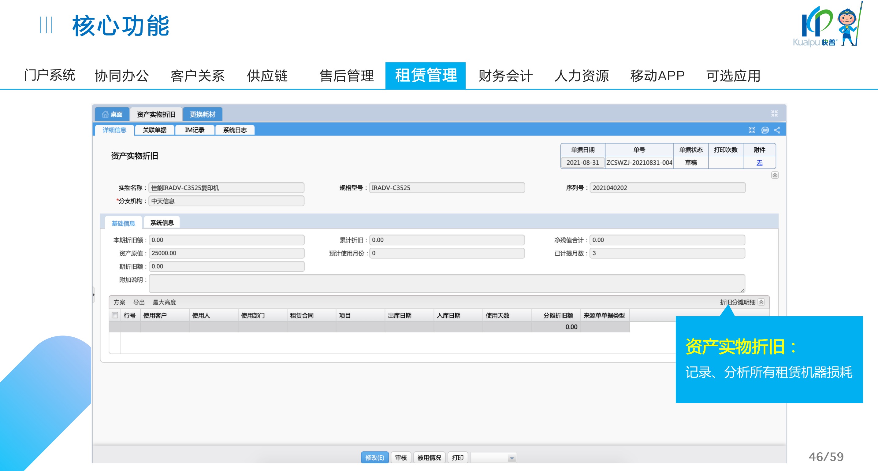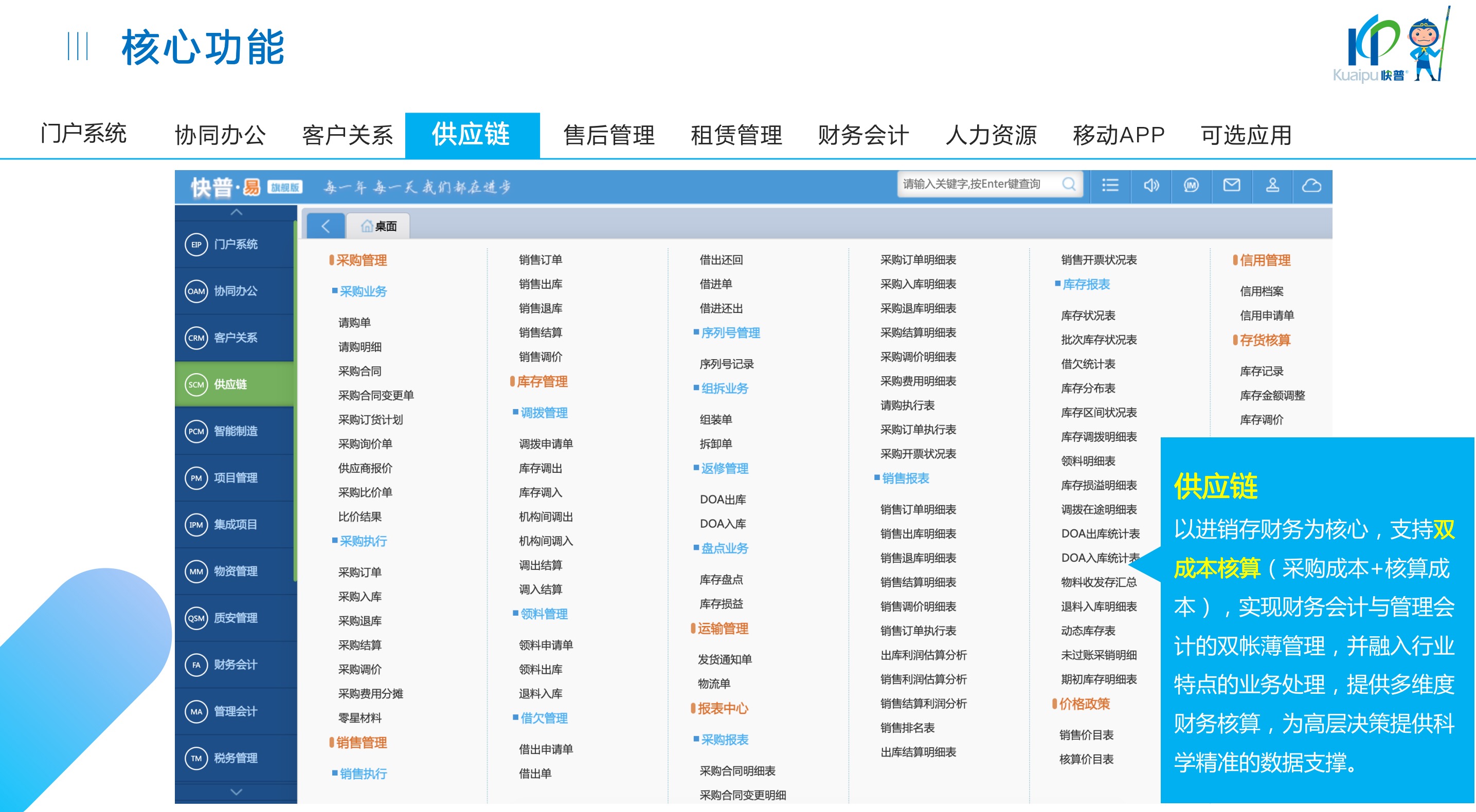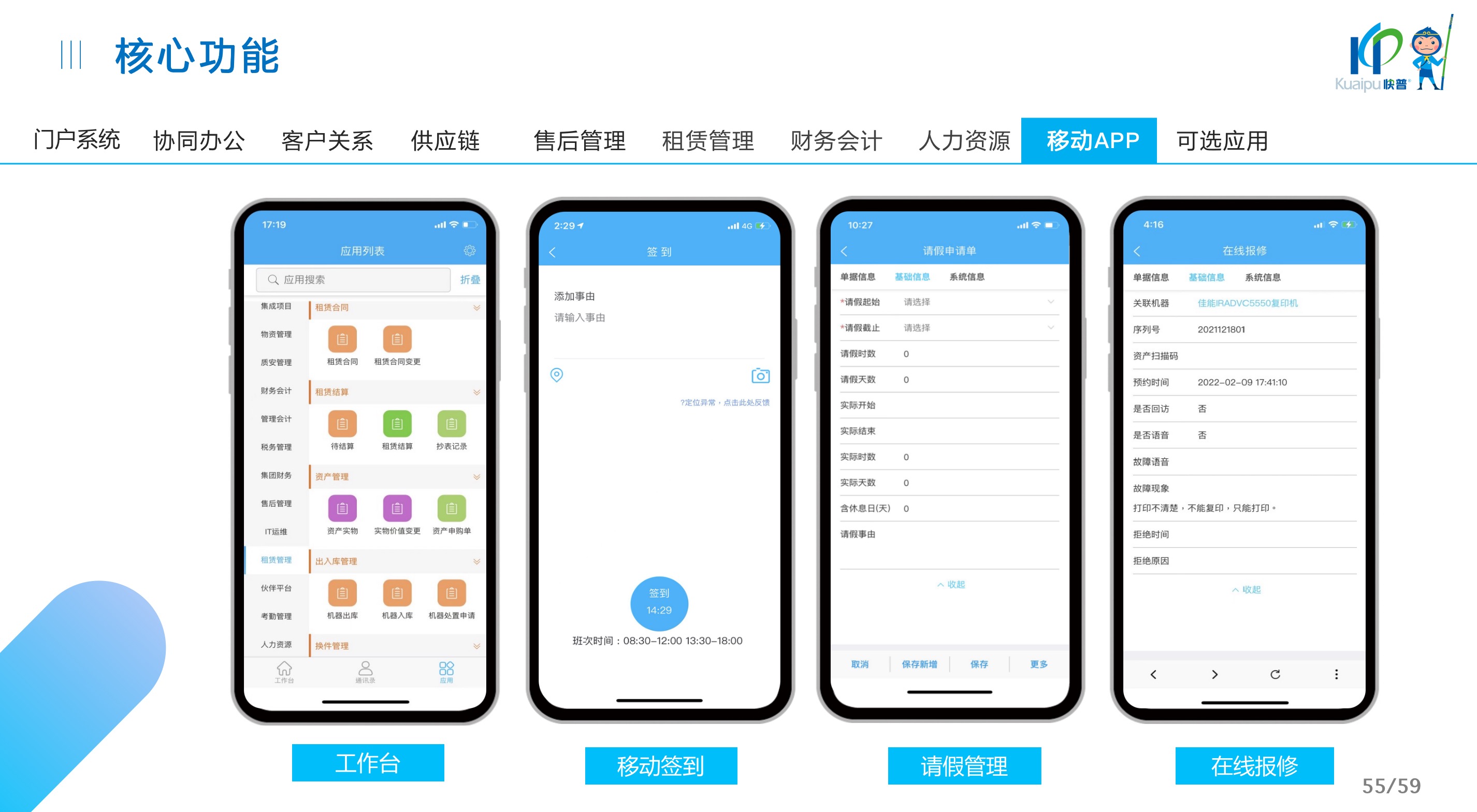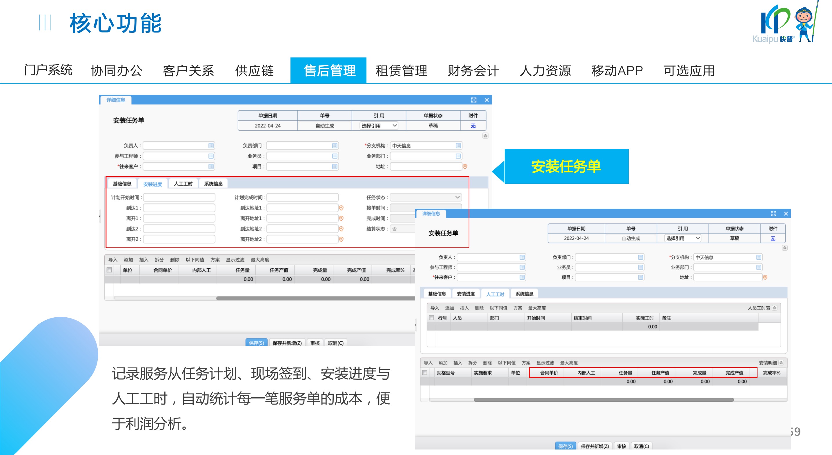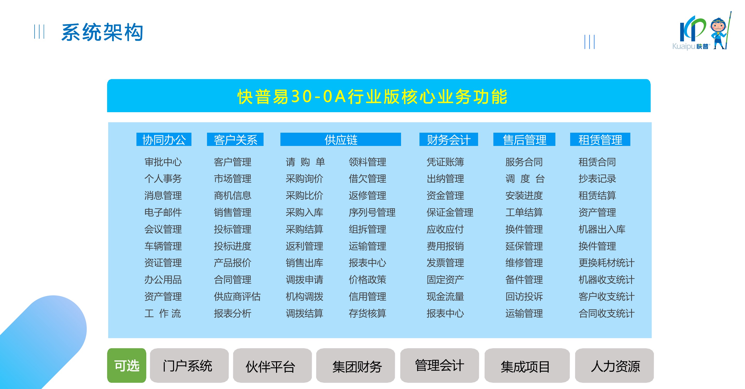 快普易30基于快普近20年在全國上萬家OA企業(yè)的實施與服務經(jīng)驗,融合了行業(yè)成功的管理智慧,以“客戶+機器”為中心提供數(shù)字化轉型解決方案,全面解決銷售、服務、租賃等多種業(yè)務模式的管理需求,以及企業(yè)經(jīng)營核算分析。