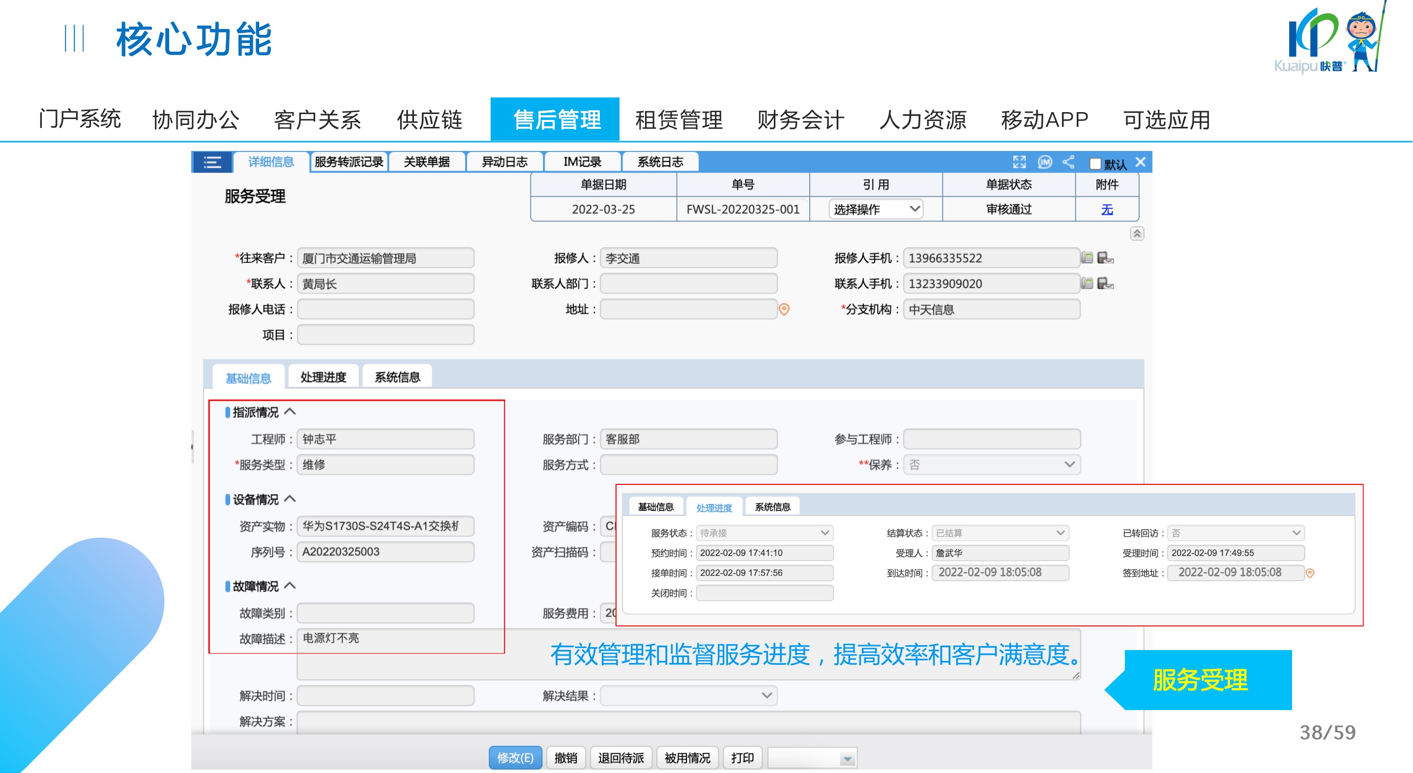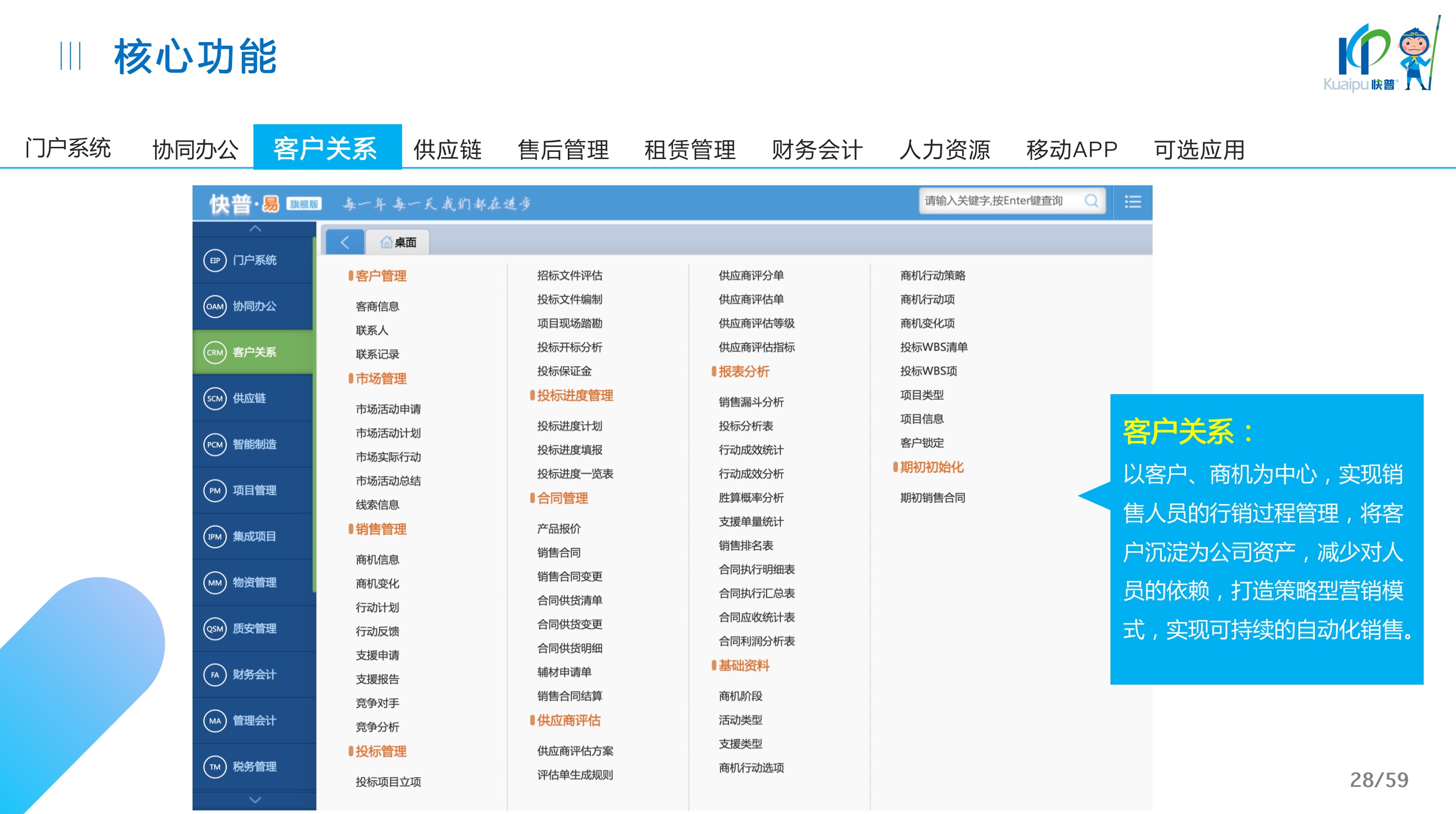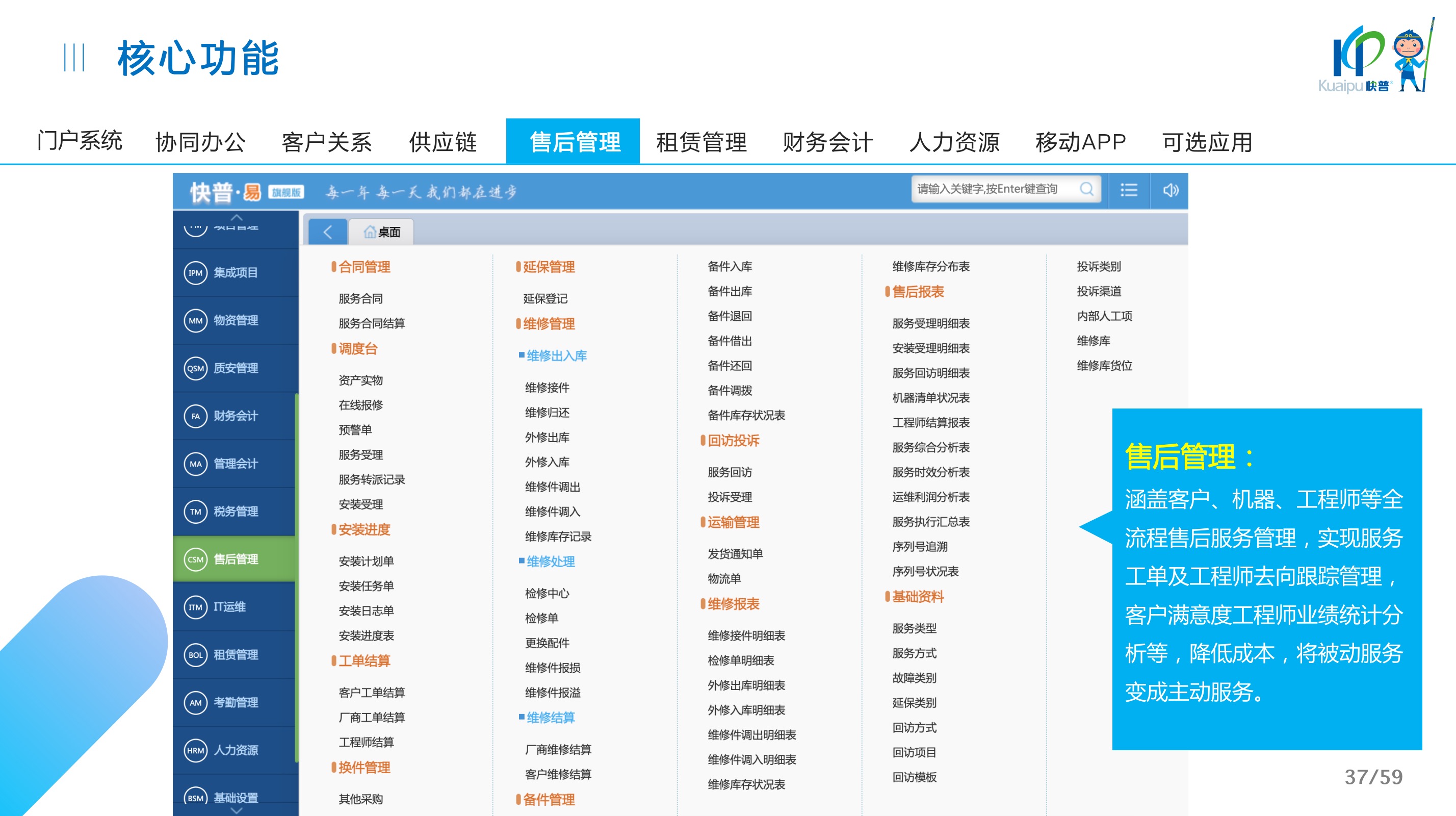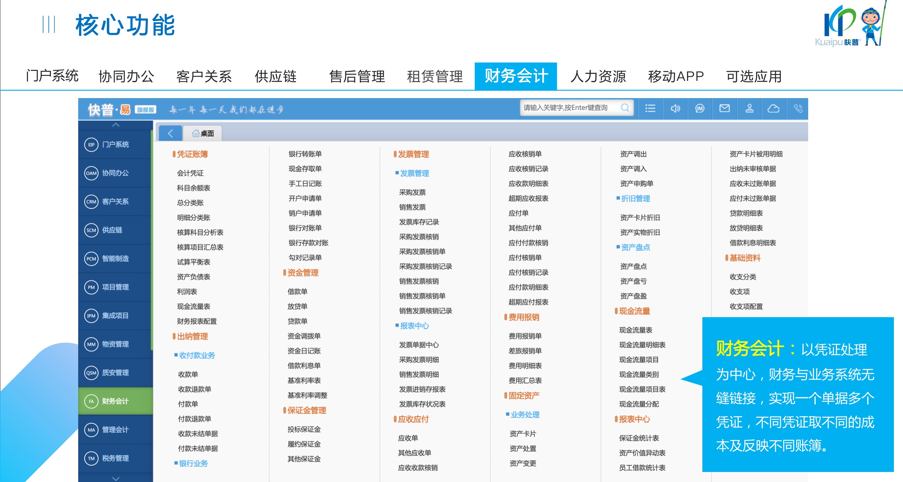 快普易30基于快普近20年在全國上萬家OA企業(yè)的實施與服務經(jīng)驗,融合了行業(yè)成功的管理智慧,以“客戶+機器”為中心提供數(shù)字化轉型解決方案,全面解決銷售、服務、租賃等多種業(yè)務模式的管理需求,以及企業(yè)經(jīng)營核算分析。