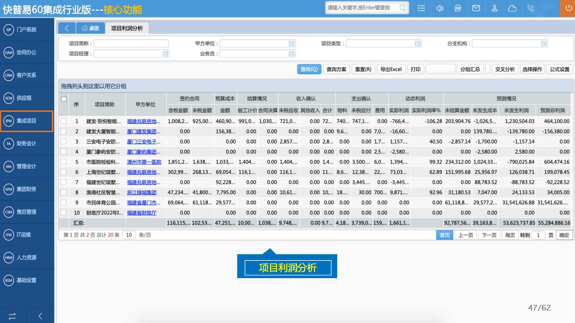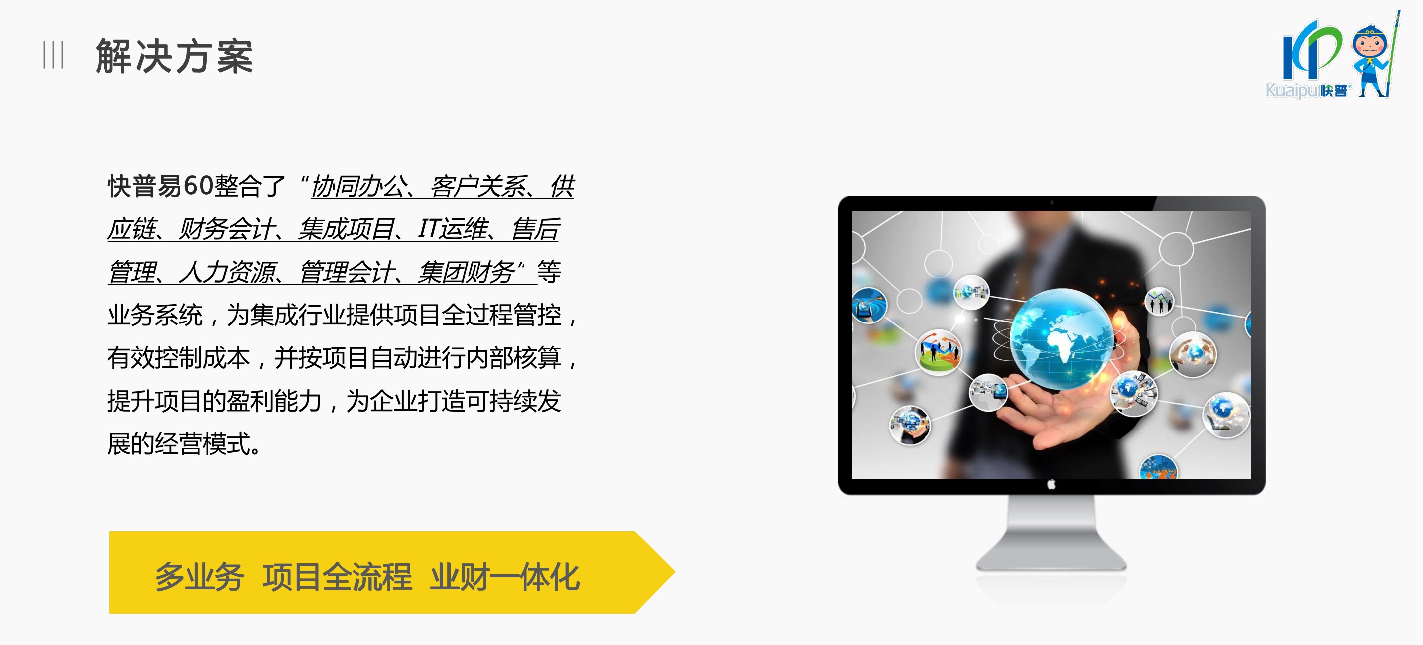 快普易60以客戶為目標(biāo)、以項(xiàng)目為核心,為集成行業(yè)提供數(shù)字化管理解決方案,為組織和業(yè)務(wù)提效,實(shí)現(xiàn)項(xiàng)目全過程管控,有效控制成本,并按項(xiàng)目自動(dòng)進(jìn)行內(nèi)部核算,提升項(xiàng)目的盈利能力,為企業(yè)打造可持續(xù)發(fā)展的經(jīng)營模式。