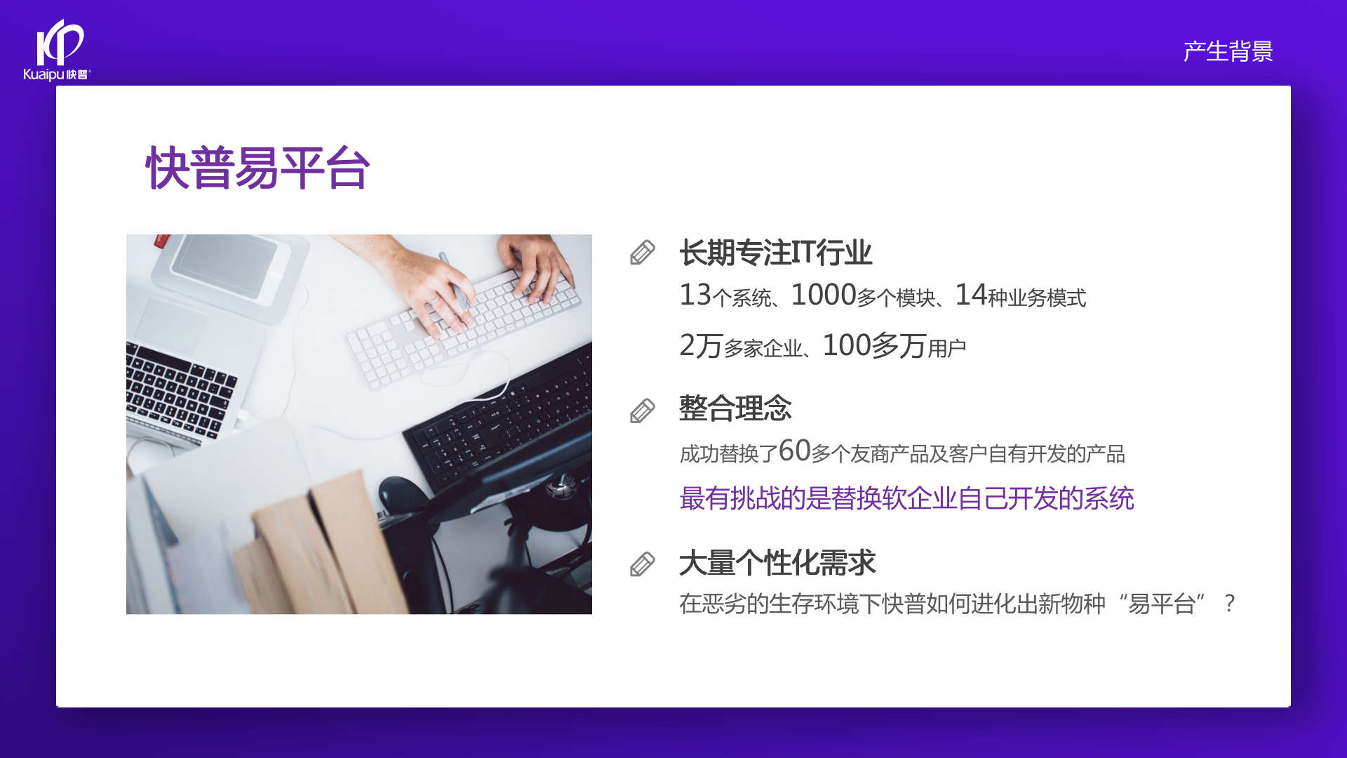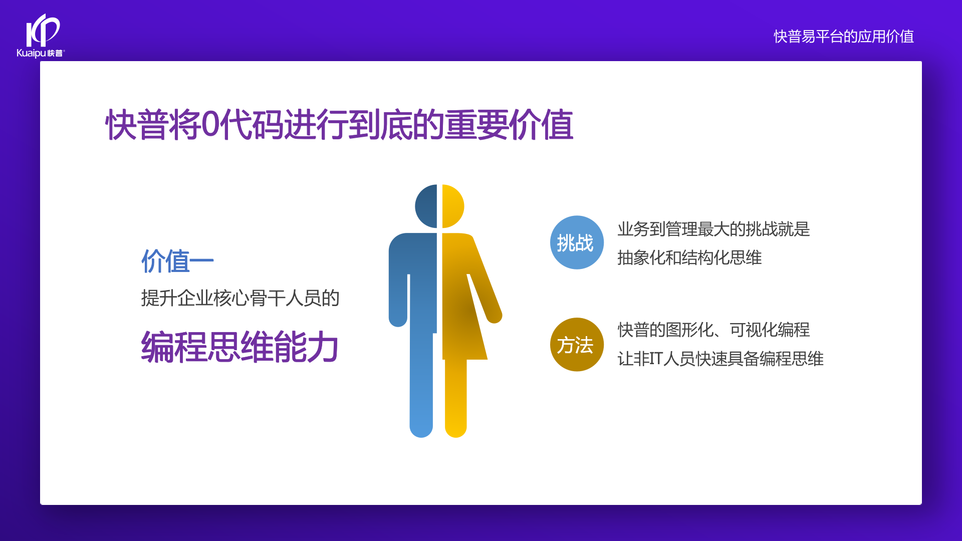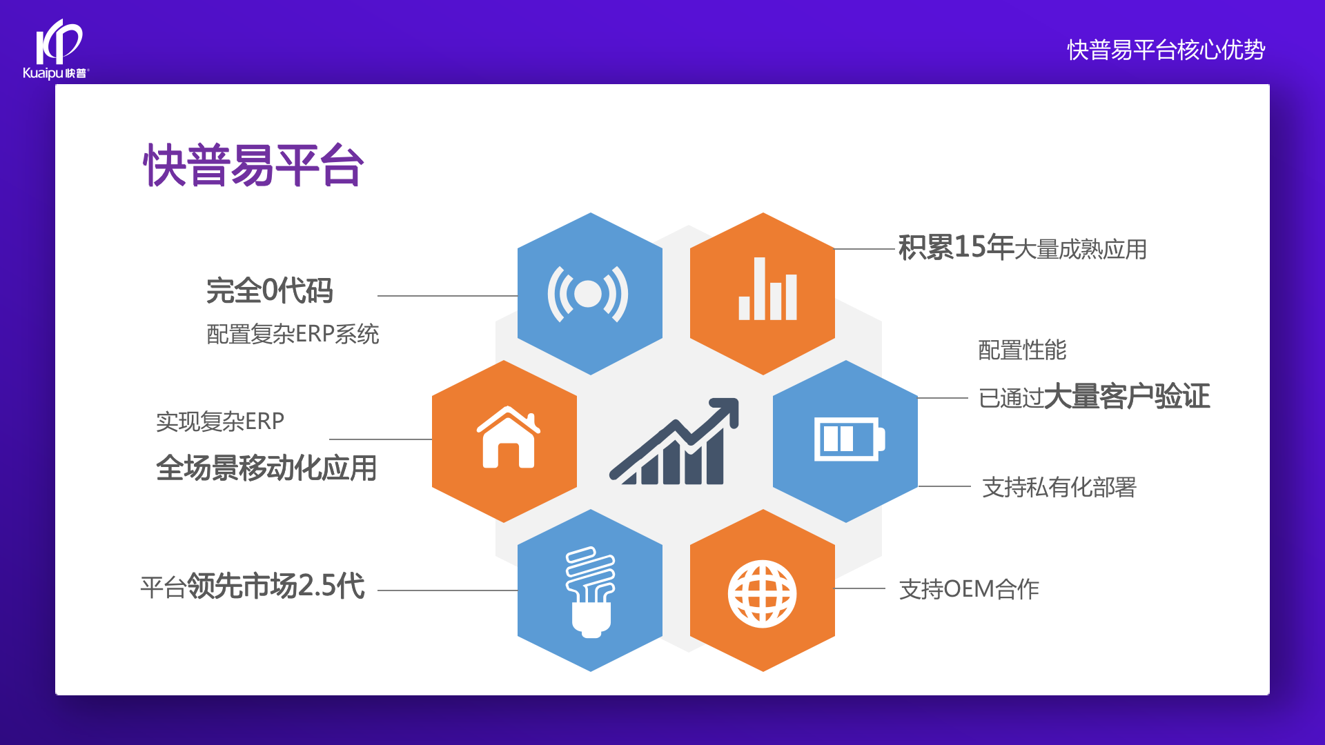 為了解決市場需求與平臺產(chǎn)品瓶頸等矛盾,實現(xiàn)徹底的零代碼平臺,快普堅持理念創(chuàng)新,以理念推動平臺技術(shù)的創(chuàng)新?!耙圆蛔儜?yīng)萬變”的理念:分析哪些東西未來肯定不變?哪些趨勢未來一定會變?從變化中找出不變的因素,從不變中找出變動的因素;從量變到質(zhì)變,經(jīng)歷萬變總結(jié)抽象出不變的本質(zhì)?;诳炱臻L期的信息化服務(wù)經(jīng)驗,開發(fā)配置出企業(yè)數(shù)字化轉(zhuǎn)型工具:快普易平臺成功解決了企業(yè)數(shù)字化轉(zhuǎn)型升級面臨的客戶大量個性化需求,真正實現(xiàn)隨需而變的設(shè)計理念,大大降低了信息化投入成本,提高信息化效率,幫助企業(yè)實現(xiàn)自主可控的技術(shù)創(chuàng)新,從而進一步推動企業(yè)的業(yè)務(wù)創(chuàng)新和管理創(chuàng)新。
