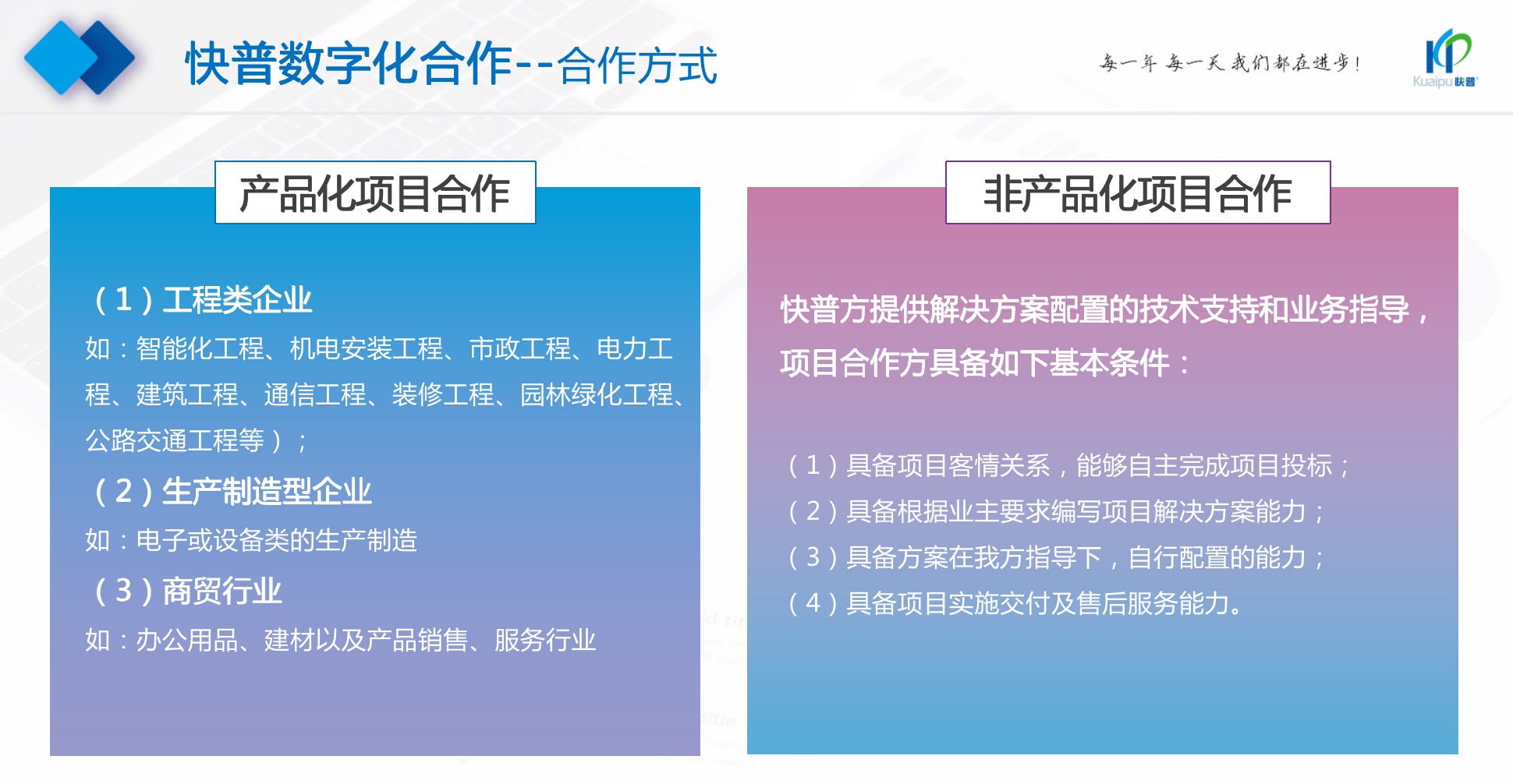 項(xiàng)目合作視合作方的貢獻(xiàn)度不同,再區(qū)分產(chǎn)品化和非產(chǎn)品化的項(xiàng)目合作,提供多種項(xiàng)目合作模式及分成比例。簽約產(chǎn)品代理具備ERP軟件業(yè)務(wù)擴(kuò)展和實(shí)施交付能力,也可視承諾量OEM產(chǎn)品。