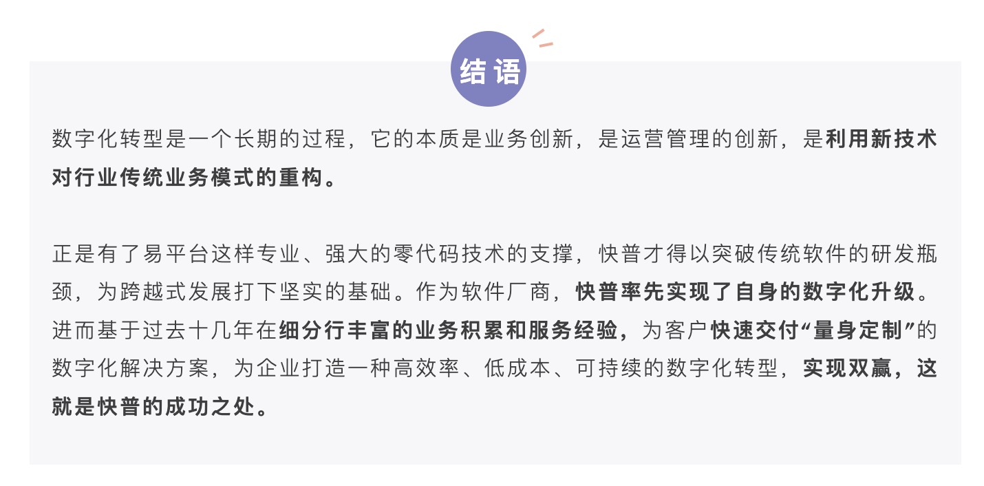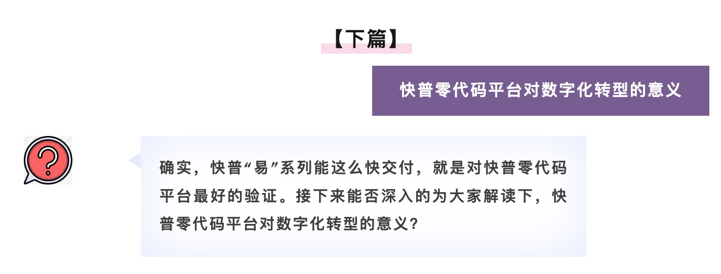 是的,我們可以很自信地說“快普零代碼平臺讓數(shù)字化轉(zhuǎn)型變得簡單、可行”。這個是面對數(shù)字化轉(zhuǎn)型的所有角色而言的,包括我們自身軟件研發(fā)、實施交付,以及合作伙伴、用戶等,易平臺在效率、成本、技術(shù)門檻和可擴展性等方面來說都有著顛覆性的突破,是非常有意義和必要的基礎(chǔ)設(shè)施??偨Y(jié)說有下面幾點: