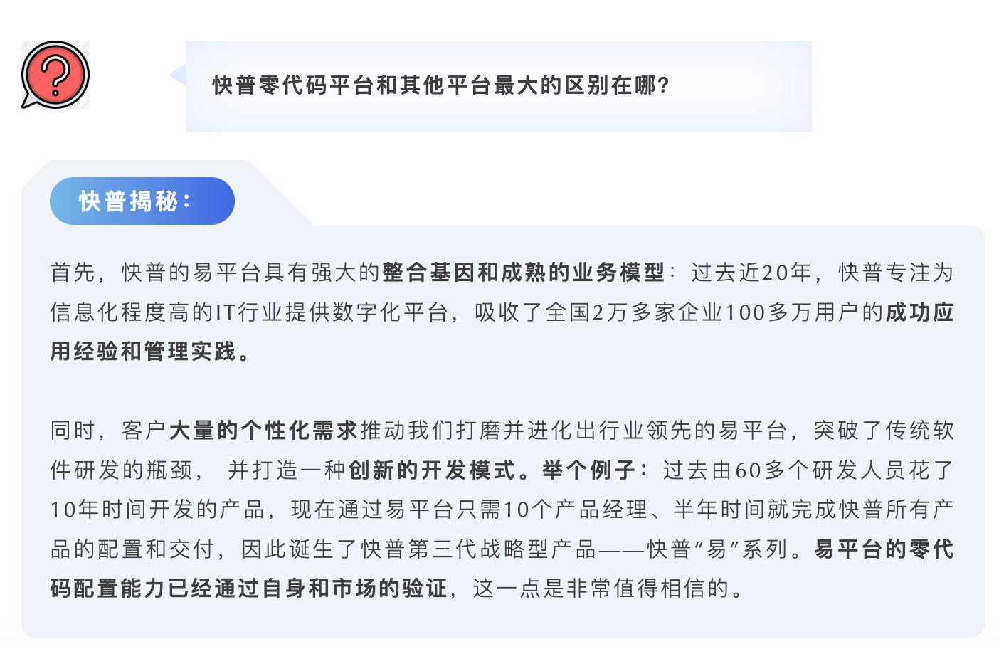 “這兩年快普已經(jīng)成功轉(zhuǎn)型為數(shù)字化平臺服務(wù)商,為客戶提供開發(fā)平臺和解決方案(產(chǎn)品)等服務(wù)。我們先從開發(fā)平臺說起,目前市場上的零代碼、低代碼平臺大致可以分為這幾類: