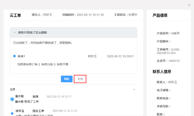 第二步:工單被客服認領后,您可看到左上角有具體的受理工程師,咨詢自動形成一個問題管理。