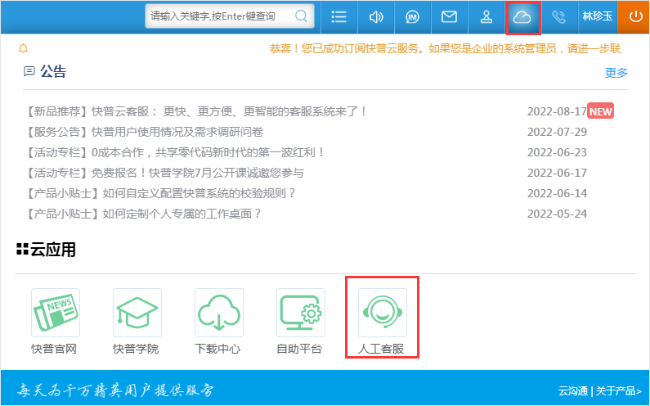 第一步: 用戶(管理員權限才可以哦)通過快普系統(tǒng)→云服務→人工客服,即可發(fā)起咨詢