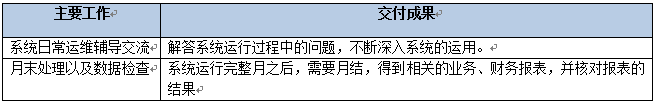 該階段主要是做系統(tǒng)開賬運作之后,持續(xù)支持運用中出現(xiàn)的所有問題,系統(tǒng)運行完整月之后,指導月結(jié),得到相關的報表數(shù)據(jù)。該階段結(jié)束以《持續(xù)支持里程碑確認單》作為交付。