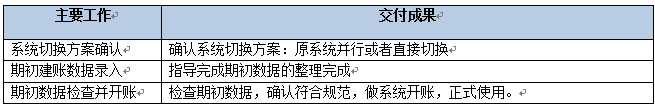 該階段主要是確認系統(tǒng)的切換方案,檢查系統(tǒng)啟賬之前的所有準備的數(shù)據(jù)的情況,確認開賬。該階段結(jié)束以《上線切換階段里程碑確認單》作為交付。