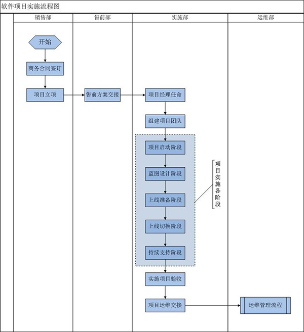 快普軟件項目實施分為五個階段:項目啟動階段、藍圖設計階段、上線準備階段、上線切換階段、持續(xù)支持階段。每個階段都有對應的階段交付成果。完成這五個階段的任務之后,進入實施項目驗收階段。實施驗收完成之后,轉(zhuǎn)入運維部門,實施過程結(jié)束。
