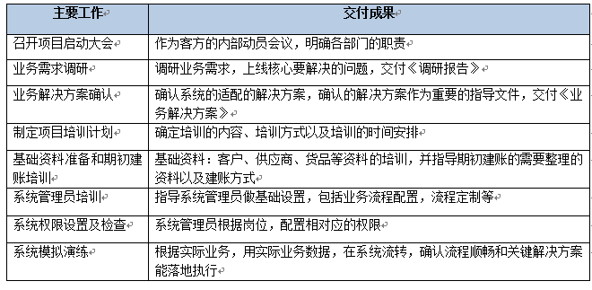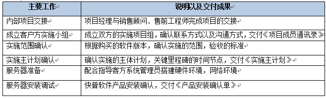 該階段主要是做實施基礎的搭建,包括完成內(nèi)部交接、確認雙方的項目組成員名單、確認實施范圍、確認實施計劃、服務器準備以及軟件部署。該階段結(jié)束以《項目啟動階段里程碑確認單》作為交付。